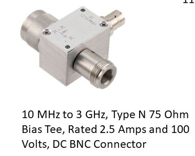 Key Specifications: Frequency Range: 10 MHz – 3 GHz Impedance: 75Ω (Type N connectors) DC Current Rating: 2.5A DC Voltage Rating: 100V DC Port Connector: BNC (for bias injection) RF Port Connectors: Type N (75Ω)